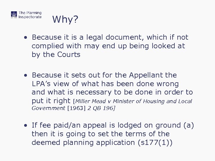 Why? • Because it is a legal document, which if not complied with may end up being looked at by the Courts • Because it sets out for the Appellant the LPA’s view of what has been done wrong and what is necessary to be done in order to put it right [Miller Mead v Minister of Housing and Local Government [1963] 2 QB 196] • If fee paid/an appeal is lodged on ground (a) then it is going to set the terms of the deemed planning application (s 177(1))