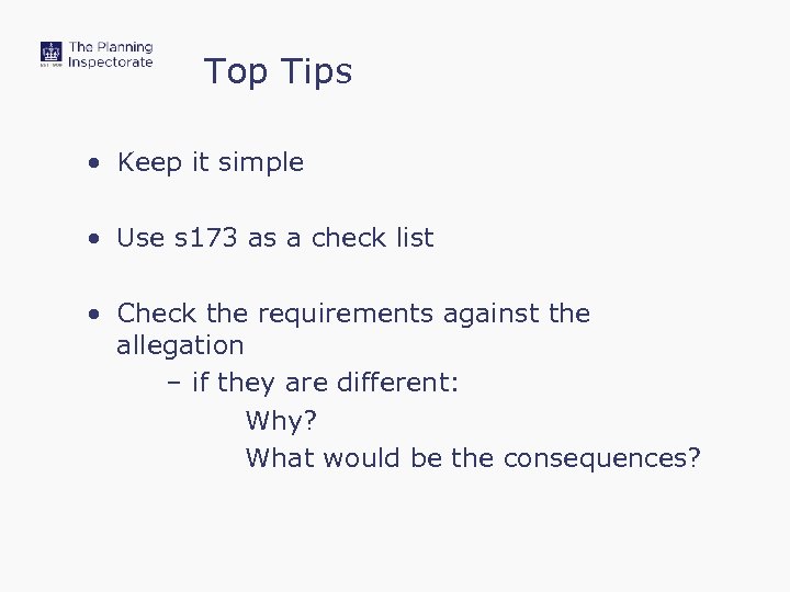 Top Tips • Keep it simple • Use s 173 as a check list • Check the requirements against the allegation – if they are different: Why? What would be the consequences?