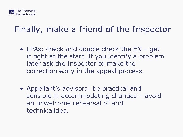 Finally, make a friend of the Inspector • LPAs: check and double check the EN – get it right at the start. If you identify a problem later ask the Inspector to make the correction early in the appeal process. • Appellant’s advisors: be practical and sensible in accommodating changes – avoid an unwelcome rehearsal of arid technicalities.