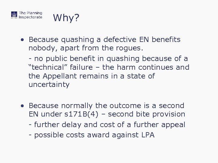 Why? • Because quashing a defective EN benefits nobody, apart from the rogues. - no public benefit in quashing because of a “technical” failure – the harm continues and the Appellant remains in a state of uncertainty • Because normally the outcome is a second EN under s 171 B(4) – second bite provision - further delay and cost of a further appeal - possible costs award against LPA