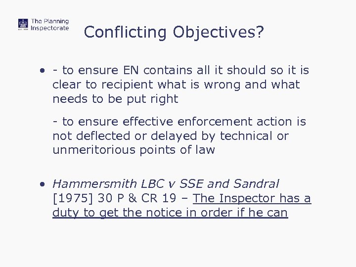 Conflicting Objectives? • - to ensure EN contains all it should so it is clear to recipient what is wrong and what needs to be put right - to ensure effective enforcement action is not deflected or delayed by technical or unmeritorious points of law • Hammersmith LBC v SSE and Sandral [1975] 30 P & CR 19 – The Inspector has a duty to get the notice in order if he can