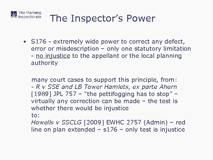 The Inspector’s Power • S 176 - extremely wide power to correct any defect, error or misdescription – only one statutory limitation - no injustice to the appellant or the local planning authority many court cases to support this principle, from: - R v SSE and LB Tower Hamlets, ex parte Ahern [1989] JPL 757 – “the pettifogging has to stop” – virtually any correction can be made – the test is whethere would be injustice to: Howells v SSCLG [2009] EWHC 2757 (Admin) – red line on plan extended – s 176 – only test is injustice