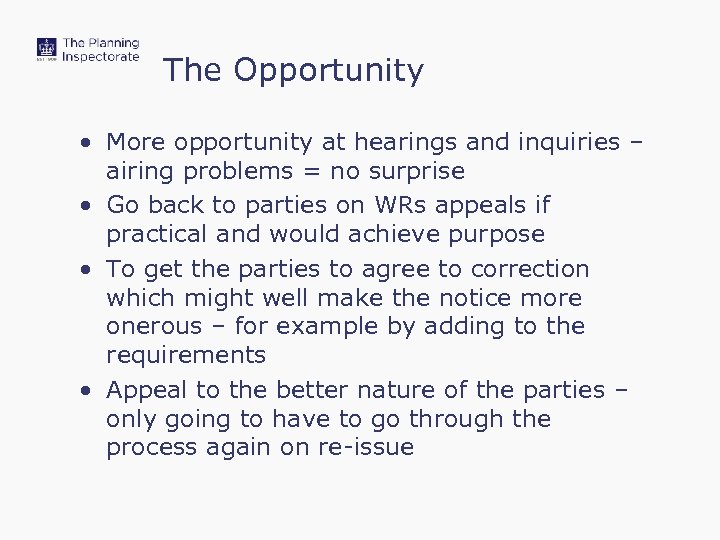 The Opportunity • More opportunity at hearings and inquiries – airing problems = no surprise • Go back to parties on WRs appeals if practical and would achieve purpose • To get the parties to agree to correction which might well make the notice more onerous – for example by adding to the requirements • Appeal to the better nature of the parties – only going to have to go through the process again on re-issue