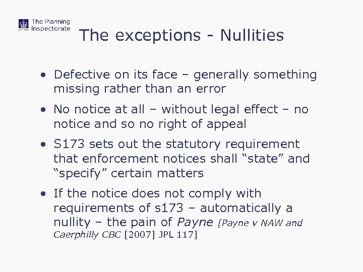 The exceptions - Nullities • Defective on its face – generally something missing rather than an error • No notice at all – without legal effect – no notice and so no right of appeal • S 173 sets out the statutory requirement that enforcement notices shall “state” and “specify” certain matters • If the notice does not comply with requirements of s 173 – automatically a nullity – the pain of Payne [Payne v NAW and Caerphilly CBC [2007] JPL 117]