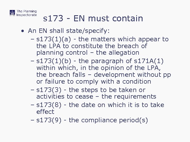 s 173 - EN must contain • An EN shall state/specify: – s 173(1)(a) - the matters which appear to the LPA to constitute the breach of planning control – the allegation – s 173(1)(b) - the paragraph of s 171 A(1) within which, in the opinion of the LPA, the breach falls – development without pp or failure to comply with a condition – s 173(3) - the steps to be taken or activities to cease – the requirements – s 173(8) - the date on which it is to take effect – s 173(9) - the compliance period(s)