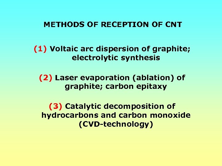 METHODS OF RECEPTION OF CNT (1) Voltaic arc dispersion of graphite; electrolytic synthesis (2) Laser evaporation (ablation) of graphite; carbon epitaxy (3) Catalytic decomposition of hydrocarbons and carbon monoxide (CVD-technology)