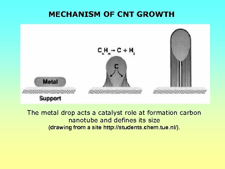 MECHANISM OF CNT GROWTH The metal drop acts a catalyst role at formation carbon nanotube and defines its size (drawing from a site http: //students. chem. tue. nl/).