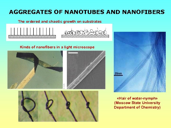 AGGREGATES OF NANOTUBES AND NANOFIBERS The ordered and chaotic growth on substrates Kinds of nanofibers in a light microscope «Hair of water-nymph» (Moscow State University Department of Chemistry)
