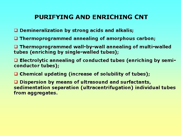 PURIFYING AND ENRICHING CNT q Demineralization by strong acids and alkalis; q Thermoprogrammed annealing of amorphous carbon; q Thermoprogrammed wall-by-wall annealing of multi-walled tubes (enriching by single-walled tubes); q Electrolytic annealing of conducted tubes (enriching by semiconductor tubes); q Chemical updating (increase of solubility of tubes); q Dispersion by means of ultrasound and surfactants, sedimentation separation (ultracentrifugation) individual tubes from aggregates.