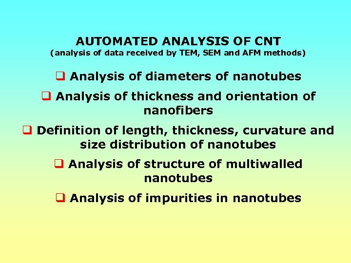 AUTOMATED ANALYSIS OF CNT (analysis of data received by TEM, SEM and АFМ methods) q Analysis of diameters of nanotubes q Analysis of thickness and orientation of nanofibers q Definition of length, thickness, curvature and size distribution of nanotubes q Analysis of structure of multiwalled nanotubes q Analysis of impurities in nanotubes