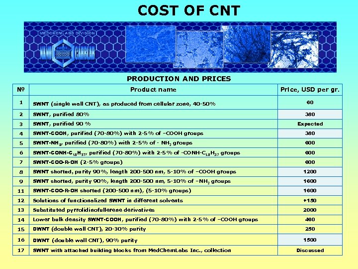 COST OF CNT PRODUCTION AND PRICES № Product name Price, USD per gr. 60 1 SWNT (single wall CNT), as produced from cellular zone, 40 -50% 2 SWNT, purified 80% 380 3 SWNT, purified 90 % Expected 4 SWNT-COOH, purified (70 -80%) with 2 -5% of –COOH groups 380 5 SWNT-NH 2, purified (70 -80%) with 2 -5% of - NH 2 groups 600 6 SWNT-CONH-C 18 H 37, purified (70 -80%) with 2 -5% of -CONH-C 18 H 37 groups 600 7 SWNT-COO-R-OH (2 -5% groups) 600 8 SWNT shorted, purity 90%, length 200 -500 nm, 5 -10% of –COOH groups 1200 9 SWNT shorted, purity 90%, length 200 -500 nm, 5 -10% of –NH 2 groups 1600 11 SWNT-COO-R-OH shorted (200 -500 nm), (5 -10% groups) 1600 12 Solutions of functionalized SWNT in different solvents +150 13 Substituted pyrrolidinofullerene derivatives 2000 14 Lower bulk density SWNT-COOH, purified (70 -80%) with 2 -5% of –COOH groups 460 15 DWNT (double wall CNT), 20 -30% purity 250 16 DWNT (double wall CNT), 90% purity 17 SWNT with attached building blocks from Med. Chem. Labs Inc. , collection 1500 Discussed