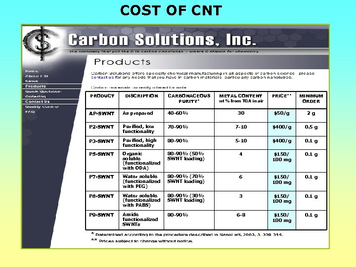COST OF CNT PRODUCT DISCRIPTION CARBONACEOUS PURITY* METAL CONTENT PRICE** MINIMUM ORDER wt % from TGA in air AP-SWNT As prepared 40 -60% 30 $50/g 2 g P 2 -SWNT Purified, low functionality 70 -90% 7 -10 $400/g 0. 5 g P 3 -SWNT Purified, high functionality 80 -90% 5 -10 $400/g 0. 1 g P 5 -SWNT Organic soluble (functionalized with ODA) 80 -90% (50% SWNT loading) 4 $150/ 100 mg 0. 1 g P 7 -SWNT Water soluble (functionalized with PEG) 80 -90% (70% SWNT loading) 6 $150/ 100 mg 0. 1 g P 8 -SWNT Water soluble (functionalized with PABS) 80 -90% (30% SWNT loading) 3 $150/ 100 mg 0. 1 g P 9 -SWNT Amide functionalized SWNTs 80 -90% 6 -8 $150/ 100 mg 0. 1 g