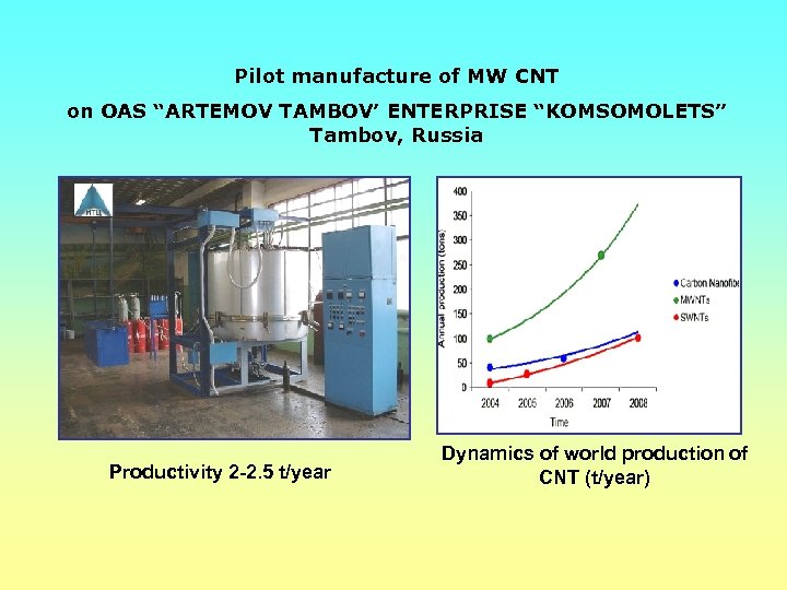 Pilot manufacture of MW CNT on OAS “ARTEMOV TAMBOV’ ENTERPRISE “KOMSOMOLETS” Tambov, Russia Productivity 2 -2. 5 t/year Dynamics of world production of CNT (t/year)