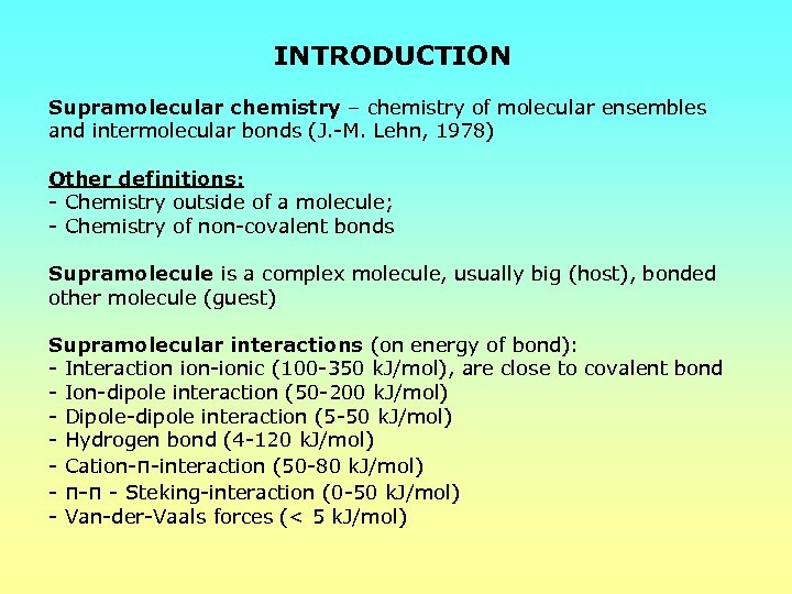 INTRODUCTION Supramolecular chemistry – chemistry of molecular ensembles and intermolecular bonds (J. -M. Lehn, 1978) Other definitions: - Chemistry outside of a molecule; - Chemistry of non-covalent bonds Supramolecule is a complex molecule, usually big (host), bonded other molecule (guest) Supramolecular interactions (on energy of bond): - Interaction ion-ionic (100 -350 k. J/mol), are close to covalent bond - Ion-dipole interaction (50 -200 k. J/mol) - Dipole-dipole interaction (5 -50 k. J/mol) - Hydrogen bond (4 -120 k. J/mol) - Cation-π-interaction (50 -80 k. J/mol) - π-π - Steking-interaction (0 -50 k. J/mol) - Van-der-Vaals forces (< 5 k. J/mol)