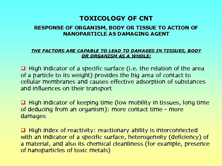 TOXICOLOGY OF CNT RESPONSE OF ORGANISM, BODY OR TISSUE TO ACTION OF NANOPARTICLE AS DAMAGING AGENT THE FACTORS ARE CAPABLE TO LEAD TO DAMAGES IN TISSUES, BODY OR ORGANISM AS A WHOLE: q High indicator of a specific surface (i. e. the relation of the area of a particle to its weight) provides the big area of contact to cellular membranes and causes effective adsorption of substances and influences on their transport q High indicator of keeping time (low mobility in tissues, long time of deducing from an organism): more contact time - more damages q High index of reactivity: reactionary ability is interconnected with an indicator of a specific surface, heterogeneity (deficiency) of a material, and also its chemical cleanliness (for example, presence of nanoparticles of toxic metals)
