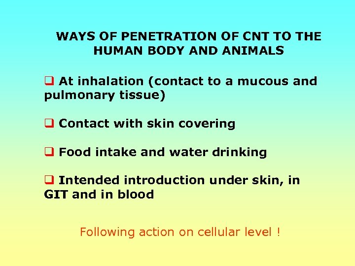 WAYS OF PENETRATION OF CNT TO THE HUMAN BODY AND ANIMALS q At inhalation (contact to a mucous and pulmonary tissue) q Contact with skin covering q Food intake and water drinking q Intended introduction under skin, in GIТ and in blood Following action on cellular level !