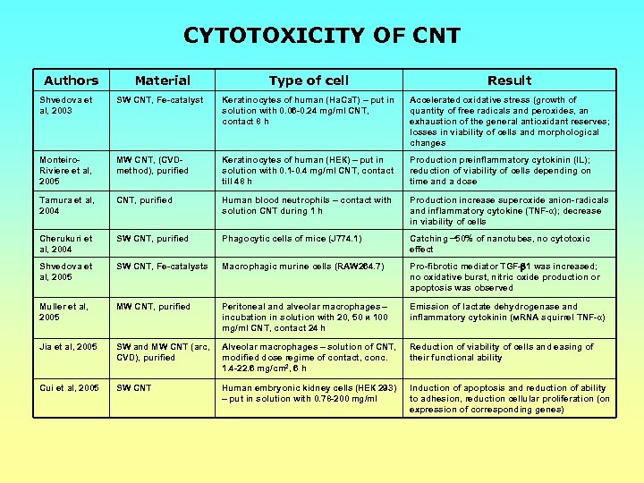 CYTOTOXICITY OF CNT Authors Material Type of cell Result Shvedova et al, 2003 SW CNT, Fe-catalyst Keratinocytes of human (На. Са. Т) – put in solution with 0. 06 -0. 24 mg/ml CNT, contact 8 h Accelerated oxidative stress (growth of quantity of free radicals and peroxides, an exhaustion of the general antioxidant reserves; losses in viability of cells and morphological changes Monteiro. Riviere et al, 2005 MW CNT, (CVDmethod), purified Keratinocytes of human (НЕК) – put in solution with 0. 1 -0. 4 mg/ml CNT, contact till 48 h Production preinflammatory cytokinin (IL); reduction of viability of cells depending on time and a dose Tamura et al, 2004 CNT, purified Human blood neutrophils – contact with solution CNT during 1 h Production increase superoxide anion-radicals and inflammatory cytokine (TNF-α); decrease in viability of cells Cherukuri et al, 2004 SW CNT, purified Phagocytic cells of mice (J 774. 1) Catching ~50% of nanotubes, no cytotoxic effect Shvedova et al, 2005 SW CNT, Fe-catalysts Macrophagic murine cells (RAW 264. 7) Pro-fibrotic mediator TGF- 1 was increased; no oxidative burst, nitric oxide production or apoptosis was observed Muller et al, 2005 MW CNT, purified Peritoneal and alveolar macrophages – incubation in solution with 20, 50 и 100 mg/ml CNT, contact 24 h Emission of lactate dehydrogenase and inflammatory cytokinin (м. RNA squirrel TNF-α) Jia et al, 2005 SW and MW CNT (arc, CVD), purified Alveolar macrophages – solution of CNT, modified dose regime of contact, conc. 1. 4 -22. 6 mg/cm 2, 6 h Reduction of viability of cells and easing of their functional ability Cui et al, 2005 SW CNT Human embryonic kidney cells (НЕК 293) – put in solution with 0. 78 -200 mg/ml Induction of apoptosis and reduction of ability to adhesion, reduction cellular proliferation (on expression of corresponding genes)