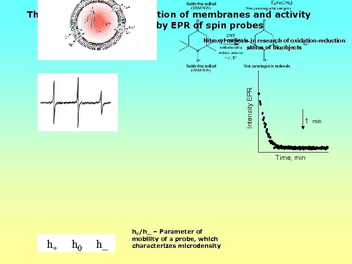 The control of barrier function of membranes and activity of mitochondria by EPR of spin probes Intensity EPR Nitroxyl radicals in research of oxidation-reduction status of bioobjects t Time, min h+ h 0 h_ h 0/h_ – Parameter of mobility of a probe, which characterizes microdensity min