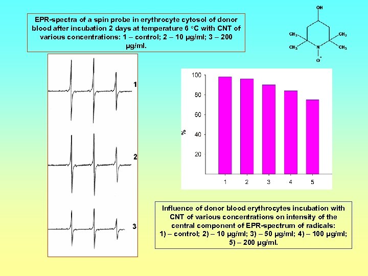 EPR-spectra of a spin probe in erythrocyte cytosol of donor blood after incubation 2 days at temperature 6 o. C with CNT of various concentrations: 1 – control; 2 – 10 μg/ml; 3 – 200 μg/ml. Influence of donor blood erythrocytes incubation with CNT of various concentrations on intensity of the central component of EPR-spectrum of radicals: 1) – control; 2) – 10 μg/ml; 3) – 50 μg/ml; 4) – 100 μg/ml; 5) – 200 μg/ml.