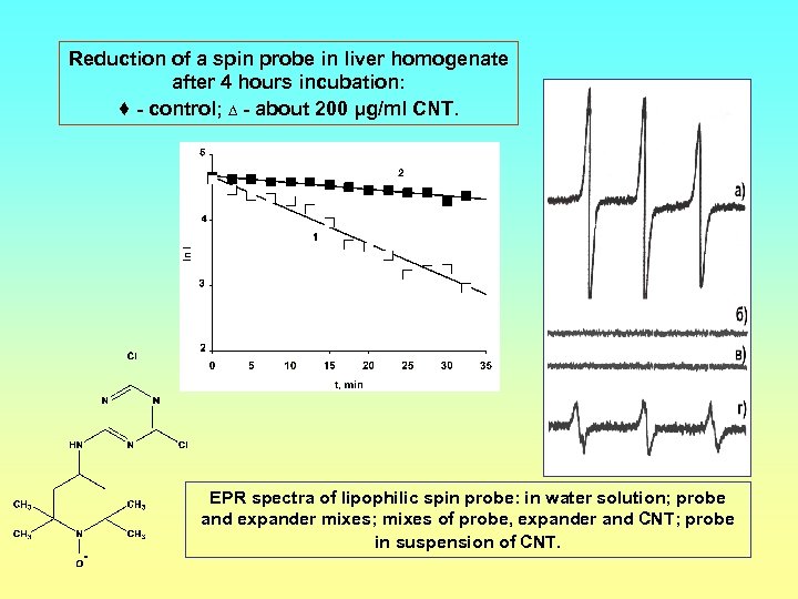 Reduction of a spin probe in liver homogenate after 4 hours incubation: ♦ - control; ∆ - about 200 μg/ml CNT. EPR spectra of lipophilic spin probe: in water solution; probe and expander mixes; mixes of probe, expander and CNT; probe in suspension of CNT.