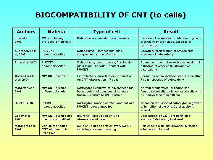 BIOCOMPATIBILITY OF CNT (to cells) Authors Material Type of cell Result Elias et al, 2002 CNT-containing orthopedic materials Osteoblasts – inoculation on material Increase of osteoblast proliferation, growth of alkaline phosphatase, absence of cytotoxicity Supronowicz et al, 2002 PLA/CNT – nanocomposites Osteoblasts – contact with nanocomposites, action of current Growth of proliferation of osteoblasts, absence of cytotoxicity Price et al, 2003 PU/CNT- nanocomposites Osteoblasts, chondrocytes, fibroblasts, plain muscular cells – contact with PU/CNT Adhesion growth of osteoblasts, easing of adhesion of other cells, absence of cytotoxicity Correa-Duarte et al, 2004 MW CNT, oxidized Fibroblasts of mice (L 929) – inoculation on CNT, observation - 7 days Formation of the isolated cells, fusion after 7 days, absence of cytotoxicity Mc. Kenzie et al, 2004 MW CNT, purified, different diameter Astrocytes ( cells which are responsible for reduction of damages of nervous tissue) – contact to CNT surface Normal proliferation, adhesion and functional activity on tubes, especially with a diameter less than 100 nm. Hu et al, 2004 PU/CNT- nanocomposites Astrocytes, aksons of rats – contact with PU/CNT nanocomposites Adhesion reduction of astrocytes, a growth of inhibition of aksons. Cytotoxicity is absent Gabay et al, 2005 MW CNT, purified and chemically modified Neurons – inoculation on CNT, observation - 4 days Localization on CNT, proliferation of aksons. Cytotoxicity is absent Mc. Knight et al, 2004 Vertically oriented CNT with immobilized DNA Cells of Chinese hamster ovary (CHO) – centrifugation and pressing Part of cells was lost, however cytotoxic effect was noted
