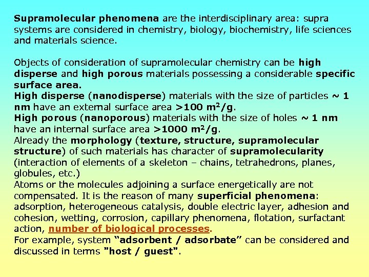 Supramolecular phenomena are the interdisciplinary area: supra systems are considered in chemistry, biology, biochemistry, life sciences and materials science. Objects of consideration of supramolecular chemistry can be high disperse and high porous materials possessing a considerable specific surface area. High disperse (nanodisperse) materials with the size of particles ~ 1 nm have an external surface area >100 m 2/g. High porous (nanoporous) materials with the size of holes ~ 1 nm have an internal surface area >1000 m 2/g. Already the morphology (texture, structure, supramolecular structure) of such materials has character of supramolecularity (interaction of elements of a skeleton – chains, tetrahedrons, planes, globules, etc. ) Atoms or the molecules adjoining a surface energetically are not compensated. It is the reason of many superficial phenomena: adsorption, heterogeneous catalysis, double electric layer, adhesion and cohesion, wetting, corrosion, capillary phenomena, flotation, surfactant action, number of biological processes. For example, system “adsorbent / adsorbate” can be considered and discussed in terms "host / guest".