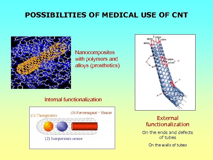 POSSIBILITIES OF MEDICAL USE OF CNT Nanocomposites with polymers and alloys (prosthetics) Internal functionalization External functionalization On the ends and defects of tubes On the walls of tubes