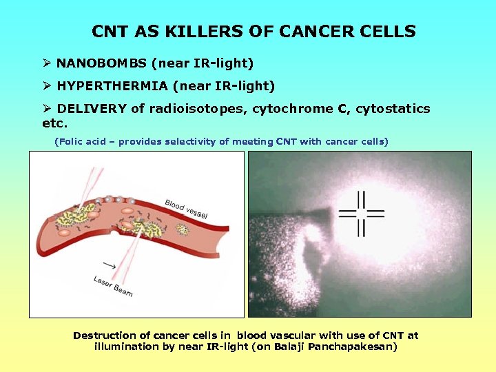 CNT AS KILLERS OF CANCER CELLS Ø NANOBOMBS (near IR-light) Ø HYPERTHERMIA (near IR-light) Ø DELIVERY of radioisotopes, cytochrome C, cytostatics etc. (Folic acid – provides selectivity of meeting CNT with cancer cells) Destruction of cancer cells in blood vascular with use of CNT at illumination by near IR-light (on Balaji Panchapakesan)