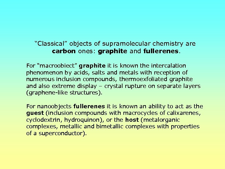 “Classical” objects of supramolecular chemistry are carbon ones: graphite and fullerenes. For “macroobiect” graphite it is known the intercalation phenomenon by acids, salts and metals with reception of numerous inclusion compounds, thermoexfoliated graphite and also extreme display – crystal rupture on separate layers (graphene-like structures). For nanoobjects fullerenes it is known an ability to act as the guest (inclusion compounds with macrocycles of calixarenes, cyclodextrin, hydroquinon), or the host (metalorganic complexes, metallic and bimetallic complexes with properties of a superconductor).