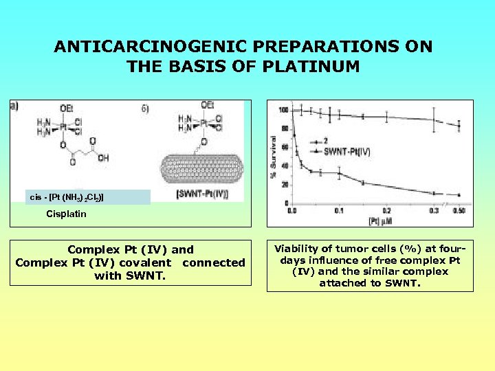 ANTICARCINOGENIC PREPARATIONS ON THE BASIS OF PLATINUM cis - [Pt (NH 3) 2 Cl 2)] Cisplatin Complex Pt (IV) and Complex Pt (IV) covalent connected with SWNT. Viability of tumor cells (%) at fourdays influence of free complex Pt (IV) and the similar complex attached to SWNT.