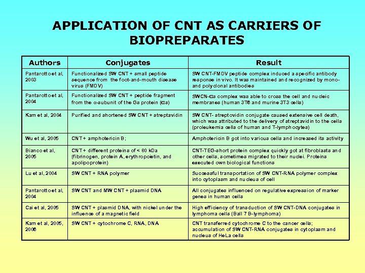 APPLICATION OF CNT AS CARRIERS OF BIOPREPARATES Authors Conjugates Result Pantarotto et al, 2003 Functionalized SW CNT + small peptide sequence from the foot-and-mouth disease virus (FMDV) SW CNT-FMDV peptide complex induced a specific antibody response in vivo. It was maintained and recognized by mono- and polyclonal antibodies Pantarotto et al, 2004 Functionalized SW CNT + peptide fragment from the α-subunit of the Gs protein (αs) SWCN-αs complex was able to cross the cell and nucleic membranes (human 3 T 6 and murine 3 T 3 cells) Kam et al, 2004 Purified and shortened SW CNT + streptavidin SW CNT- streptovidin conjugate caused extensive cell death, which was attributed to the delivery of streptavidin to the cells (proleukemia cells of human and T-lymphocytes) Wu et al, 2005 CNT + amphotericin B; Amphotericin B got into various cells and increased its activity Bianco et al, 2005 CNT + different proteins of < 80 k. Da (fibrinogen, protein A, erythropoietin, and apolipoprotein) CNT-TEG-short protein complex quickly got at fibroblasts and other cells, sometimes migrated to their nuclei. Proteins executed own biological functions Lu et al, 2004 SW CNT + RNA polymer Successful transportation of SW CNT-RNA polymer complex into cytoplasm and nucleus of cell Pantarotto et al, 2004 SW CNT and MW CNT + plasmid DNA All conjugates influenced on regulative expression of marker genes in human cells Cai et al, 2005 SW CNT + plasmid DNA, with nickel under the influence of a magnetic field High efficiency of transduction of SW CNT-DNA conjugates in lymphoma cells (Ball 7 B-lymphoma) Kam et al, 2005, 2006 SW CNT + cytochrome C, RNA, DNA CNT transferred cytochrome C to the cancer cells; accumulation of SW CNT-RNA conjugates in cytoplasm and nucleus of He. La cells