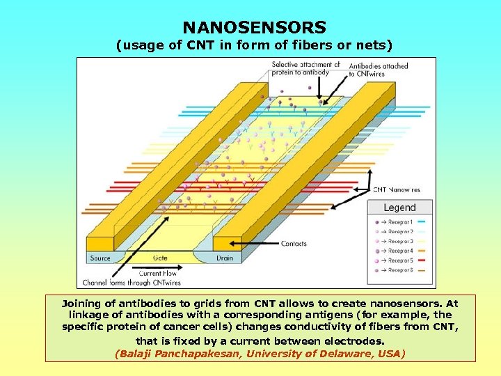 NANOSENSORS (usage of CNT in form of fibers or nets) Joining of antibodies to grids from CNT allows to create nanosensors. At linkage of antibodies with a corresponding antigens (for example, the specific protein of cancer cells) changes conductivity of fibers from CNT, that is fixed by a current between electrodes. (Balaji Panchapakesan, University of Delaware, USA)