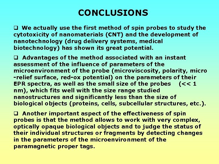 CONCLUSIONS q We actually use the first method of spin probes to study the cytotoxicity of nanomaterials (CNT) and the development of nanotechnology (drug delivery systems, medical biotechnology) has shown its great potential. q Advantages of the method associated with an instant assessment of the influence of parameters of the microenvironment of the probe (microviscosity, polarity, micro -relief surface, red-ox potential) on the parameters of their EPR spectra, as well as the small size of the probes (<< 1 nm), which fits well with the size range studied nanostructures and significantly less than the size of biological objects (proteins, cells, subcellular structures, etc. ). q Another important aspect of the effectiveness of spin probes is that the method allows to work with very complex, optically opaque biological objects and to judge the status of their individual structures or fragments by detecting changes in the parameters of the microenvironment of the paramagnetic proper tags.