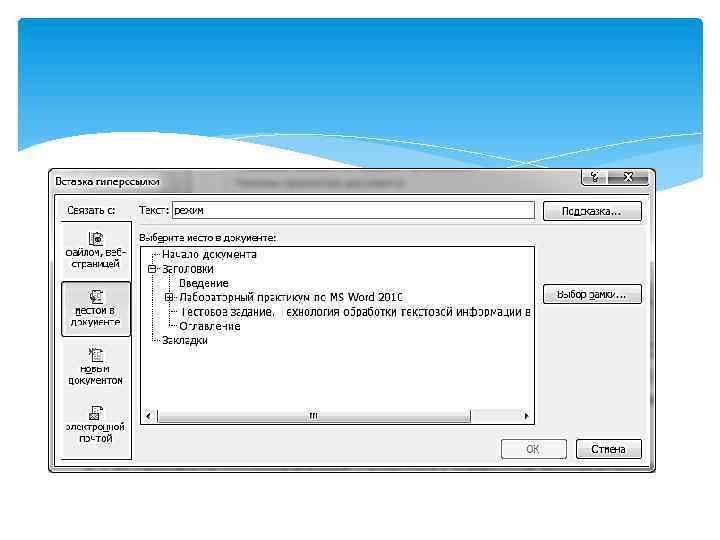 Гиперссылки в тексте предназначены для перехода к определенному месту в документе, web-странице в сети Интернет, файлу на компьютере, приложению для создания электронного письма адресату. Рассмотрим порядок создания гиперссылки на элементы текущего документа. 1. Выделить символ, фрагмент текста или графический объект, который будет представлять гиперссылку. 2. Выполнить команду Вставка → Ссылки → Гиперссылка. 3. В появившемся окне Вставка гиперссылки (рис. 4. 4) на панели слева Связать с выбрать пункт местом в документе. 4. В области Выберите место в документе указать место перехода по гиперссылке.