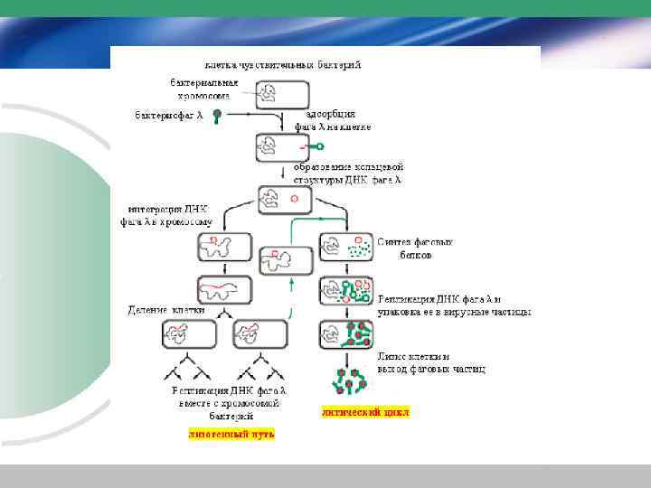 • Вирулентные фаги – всегда лизируют зараженные ими бактерии и имеют только один путь развития - литический цикл. • Умеренные фаги могут вести себя по-разному: – после проникновения в клетку нуклеиновая кислота фага либо вовлекается в литический цикл, – либо вступает с клеткой-хозяином в своего рода симбиотические отношения, • встраивается в хромосому бактериальной клетки (превращается в профаг) и передается всему потомству данной клетки. • Бактерии, которые содержат профаг, называются лизогенными.
