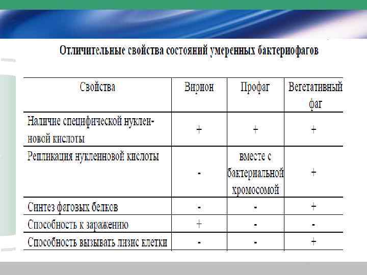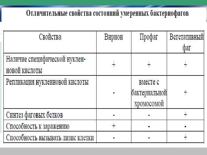 • умеренные бактериофаги могут находиться в трех состояниях: – в свободном состоянии в виде частиц вирионов: – в состоянии профага: – в вегетативном (активном) состоянии, • когда бактериофаг способен вызывать лизис бактериальной клетки.