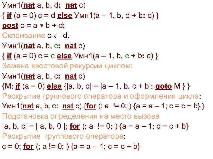 Умн 1(nat a, b, d: nat c) { if (a = 0) c = d else Умн 1(a – 1, b, d + b: c) } post c = a b + d; Склеивание c d. Умн 1(nat a, b, c: nat c) { if (a = 0) c = c else Умн 1(a – 1, b, с + b: c) } Замена хвостовой рекурсии циклом: Умн 1(nat a, b, c: nat c) {M: if (a = 0) else {|a, b, c| = |a – 1, b, с + b|; goto M } } Раскрытие группового оператора и оформления цикла: Умн 1(nat a, b, c: nat c) {for (; a != 0; ) {a = a – 1; c = с + b} } Подстановка определения на место вызова |a, b, c| = | a, b, 0 |; for (; a != 0; ) {a = a – 1; c = с + b} Раскрытие группового оператора: c = 0; for (; a != 0; ) {a = a – 1; c = с + b}