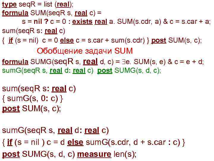 type seq. R = list (real); formula SUM(seq. R s, real c) = s = nil ? c = 0 : exists real a. SUM(s. cdr, a) & c = s. car + a; sum(seq. R s: real c) { if (s = nil) c = 0 else c = s. car + sum(s. cdr) } post SUM(s, c); Обобщение задачи SUM formula SUMG(seq. R s, real d, c) = e. SUM(s, e) & c = e + d; sum. G(seq. R s, real d: real c) post SUMG(s, d, c); sum(seq. R s: real c) { sum. G(s, 0: c) } post SUM(s, c); sum. G(seq. R s, real d: real c) { if (s = nil ) c = d else sum. G(s. cdr, d + s. car : c) } post SUMG(s, d, c) measure len(s);
