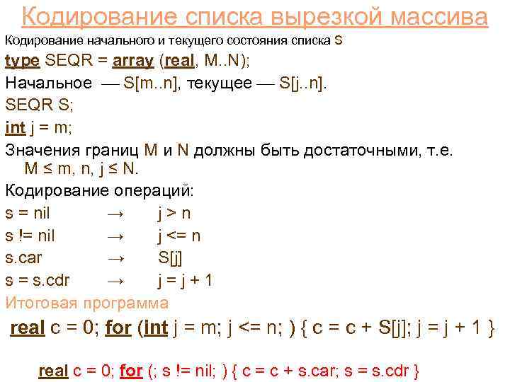 Кодирование списка вырезкой массива Кодирование начального и текущего состояния списка S type SEQR = array (real, M. . N); Начальное S[m. . n], текущее S[j. . n]. SEQR S; int j = m; Значения границ M и N должны быть достаточными, т. е. M ≤ m, n, j ≤ N. Кодирование операций: s = nil → j > n s != nil → j <= n s. car → S[j] s = s. cdr → j = j + 1 Итоговая программа real c = 0; for (int j = m; j <= n; ) { c = с + S[j]; j = j + 1 } real c = 0; for (; s != nil; ) { c = с + s. car; s = s. cdr }