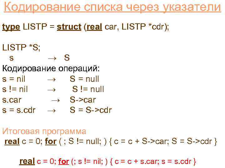 Кодирование списка через указатели type LISTP = struct (real car, LISTP *cdr); LISTP *S; s → S Кодирование операций: s = nil → S = null s != nil → S != null s. car → S->car s = s. cdr → S = S->cdr Итоговая программа real c = 0; for ( ; S != null; ) { c = с + S->car; S = S->cdr } real c = 0; for (; s != nil; ) { c = с + s. car; s = s. cdr }