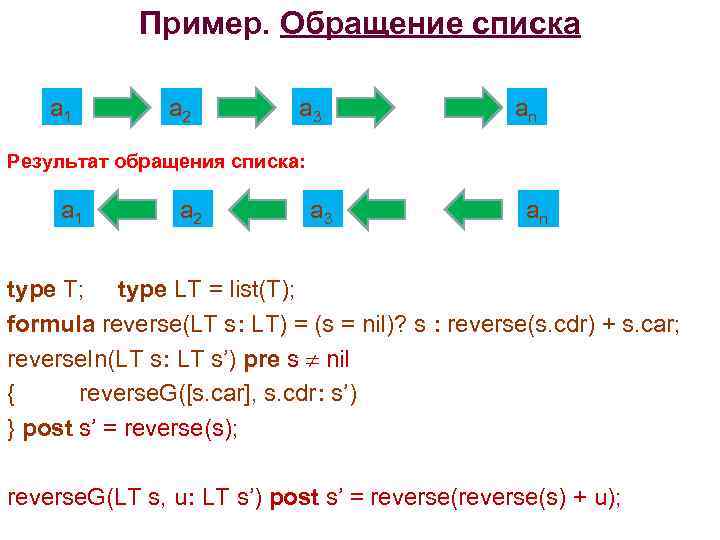 Пример. Обращение списка a 1 a 2 a 3 an Результат обращения списка: a 1 a 2 a 3 an type T; type LT = list(T); formula reverse(LT s: LT) = (s = nil)? s : reverse(s. cdr) + s. car; reverse. In(LT s: LT s’) pre s nil { reverse. G([s. car], s. cdr: s’) } post s’ = reverse(s); reverse. G(LT s, u: LT s’) post s’ = reverse(s) + u);