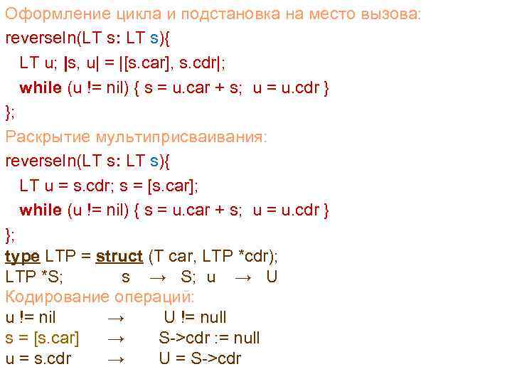 Оформление цикла и подстановка на место вызова: reverse. In(LT s: LT s){ LT u; |s, u| = |[s. car], s. cdr|; while (u != nil) { s = u. car + s; u = u. cdr } }; Раскрытие мультиприсваивания: reverse. In(LT s: LT s){ LT u = s. cdr; s = [s. car]; while (u != nil) { s = u. car + s; u = u. cdr } }; type LTP = struct (T car, LTP *cdr); LTP *S; s → S; u → U Кодирование операций: u != nil → U != null s = [s. car] → S->cdr : = null u = s. cdr → U = S->cdr