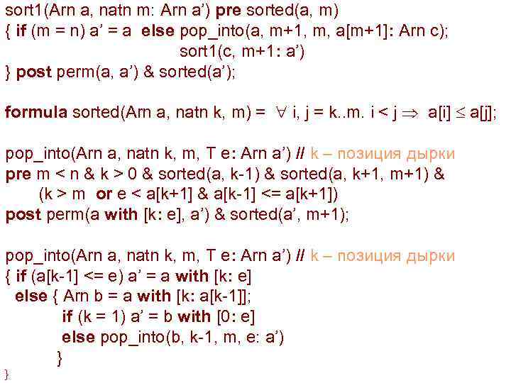 a a’, c sort 1(Arn a, natn m: a) pre sorted(a, m) { if (m = n) a = a else { T e = a[m+1]; if (a[m] <= e) sort 1(a, m+1: a) else { pop_into(a, m+1, m, e: Arn a); sort 1(a, m+1: a) } } } a a’, b pop_into(Arn a, natn k, m, T e: a) // k – позиция дырки { a = a with [k: a[k-1]]; if (k = 1) a = a with [0: e] else if (a[k-2] <= e) a = a with [k-1: e] else pop_into(a, k-1, m, e: a) };