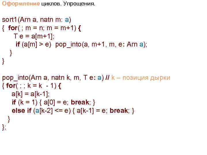Оформление циклов. Упрощения. sort 1(Arn a, natn m: a) { for( ; m = n; m = m+1) { T e = a[m+1]; if (a[m] > e) pop_into(a, m+1, m, e: Arn a); } } pop_into(Arn a, natn k, m, T e: a) // k – позиция дырки { for( ; ; k = k - 1) { a[k] = a[k-1]; if (k = 1) { a[0] = e; break; } else if (a[k-2] <= e) { a[k-1] = e; break; } } };