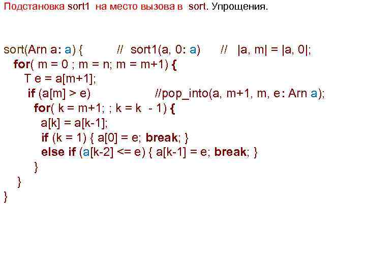 Подстановка sort 1 на место вызова в sort. Упрощения. sort(Arn a: a) { // sort 1(a, 0: a) // |a, m| = |a, 0|; for( m = 0 ; m = n; m = m+1) { T e = a[m+1]; if (a[m] > e) //pop_into(a, m+1, m, e: Arn a); for( k = m+1; ; k = k - 1) { a[k] = a[k-1]; if (k = 1) { a[0] = e; break; } else if (a[k-2] <= e) { a[k-1] = e; break; } } } }