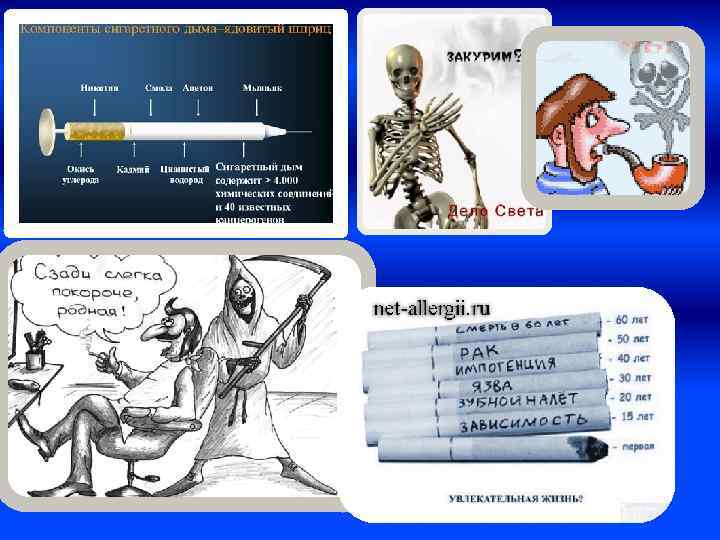 РЕЗУЛЬТАТ Табачный дым попадает в организм курильщика через органы дыхания, компоненты, находящиеся в табачном дыму, раздражают слизистую оболочку дыхательных путей, вызывая её воспаление. Появляется мучительный кашель. Голосовые связки, расположенные в дыхательных путях, также воспаляются, в результате голос приобретает грубый тембр, становится хриплым, а затем сиплым. В лёгких при курении постепенно скапливается табачный дым и сажа. Мучительный кашель травмирует ткани лёгкого, снижает их эластичность, накапливается слизь, происходит вздутие лёгких, значительно ослабевает дыхание. При курении возникают изменения в нервной системе, обусловленные прежде всего действием никотина. Никотин вызывает сильное возбуждение клеток коры головного мозга, но через некоторое время эти клетки, устав, затормаживаются, снижают свою деятельность. Кроме того, углекислый газ, соединяясь с гемоглобином, лишает его возможности усваивать кислород и снабжать им органы и ткани. Нарушается питание головного мозга, следствием чего является ухудшение памяти, внимания, рост утомляемости, снижение общей эффективности работы. Появляется повышенная утомляемость глаз, ухудшается слух, снижается скорость чтения, увеличивается число совершаемых ошибок. Воздействие табачных веществ на сердце сложно и многообразно: учащается пульс, повышается кровяное давление, увеличивается нагрузка на сердце, нарушается питание сердечной мышцы, что приводит к возникновению тяжёлых заболеваний сердца. Компоненты табачного дыма поражают сосуды, поэтому у курильщиков появляются головная боль, отёки и боль в нижних конечностях, ощущение тяжести при ходьбе. Табачный дым, воздействуя на органы пищеварения, вызывает раздражение слизистой оболочки полости рта. В результате этого появляется кровоточивость дёсен, трескается эмаль (защитный покров зубов), открывая доступ к проникновению микробов в полость рта. Меняется цвет зубов. Губы сохнут, на них появляются трещины. Вредные вещества табачного дыма, растворяясь в слюне, попадают в желудок и вызывают раздражение слизистой оболочки. Развивается гастрит, язвенная болезнь желудка. Увеличивается вероятность возникновения раковых заболеваний
