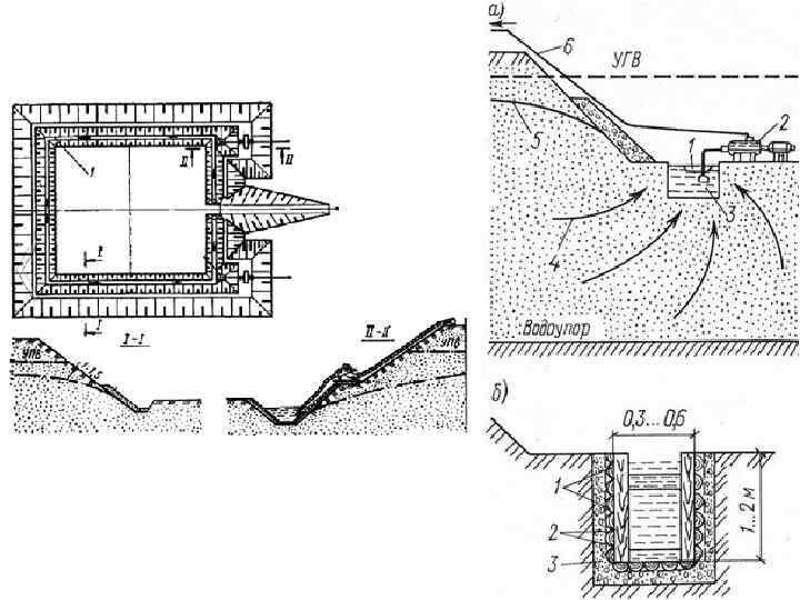 ТИПОВЫЕ ДРЕНАЖНЫЕ УСТРОЙСТВА 1. 2. 3. • • • 1 а – закрытый беструбчатый; 1 б – трубчатый совершенный; 1 в – трубчатый несовершенный; 1 г – дренажная галерея 2 – разрез дренажа; 3 – пластовый дренаж;