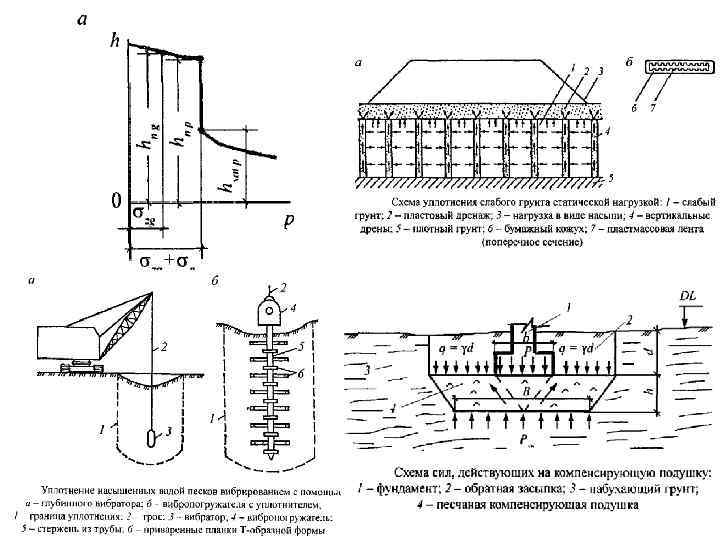 Уплотнения слабых водонасыщенных грунтов песчаными дренами и пригрузкой территории Схема уплотнения слабых водонасыщенных грунтов песчаными дренами и пригрузкой территории 1 - фильтрующая пригрузка; 2 - слабый грунт; 3 - песчаная дрена; 4 подстилающий дренирующий слой