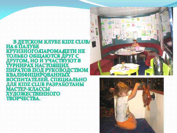 На борту парома незнайка, его друг пончик, винтик и шпунтик. Незнайка на борту – это развлечения для детей и молодежи. В круизной программе фотографирование, бинго и забавные игры. Ребенку можно приобрести браслет The Simpsons. С ним маленький пассажир получит надувной шарик и стаканчик с портретом доктора пилюлькина. А еще – лимонад без ограничений весь круиз. Браслет можно купить в любом баре на борту.