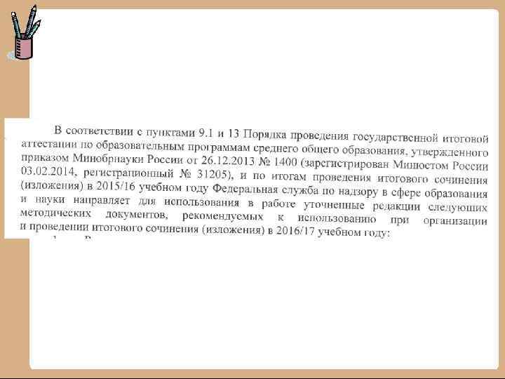 • Сами темы сочинений станут известны выпускникам за 15 минут до начала экзамена. Результатом итогового сочинения (изложения) будет «зачет» или «незачет» , однако к сдаче единого государственного экзамена и государственного выпускного экзамена допустят только выпускников, получивших «зачет» . • Темы, как и в прошлом году, будут сформированы по часовым поясам.